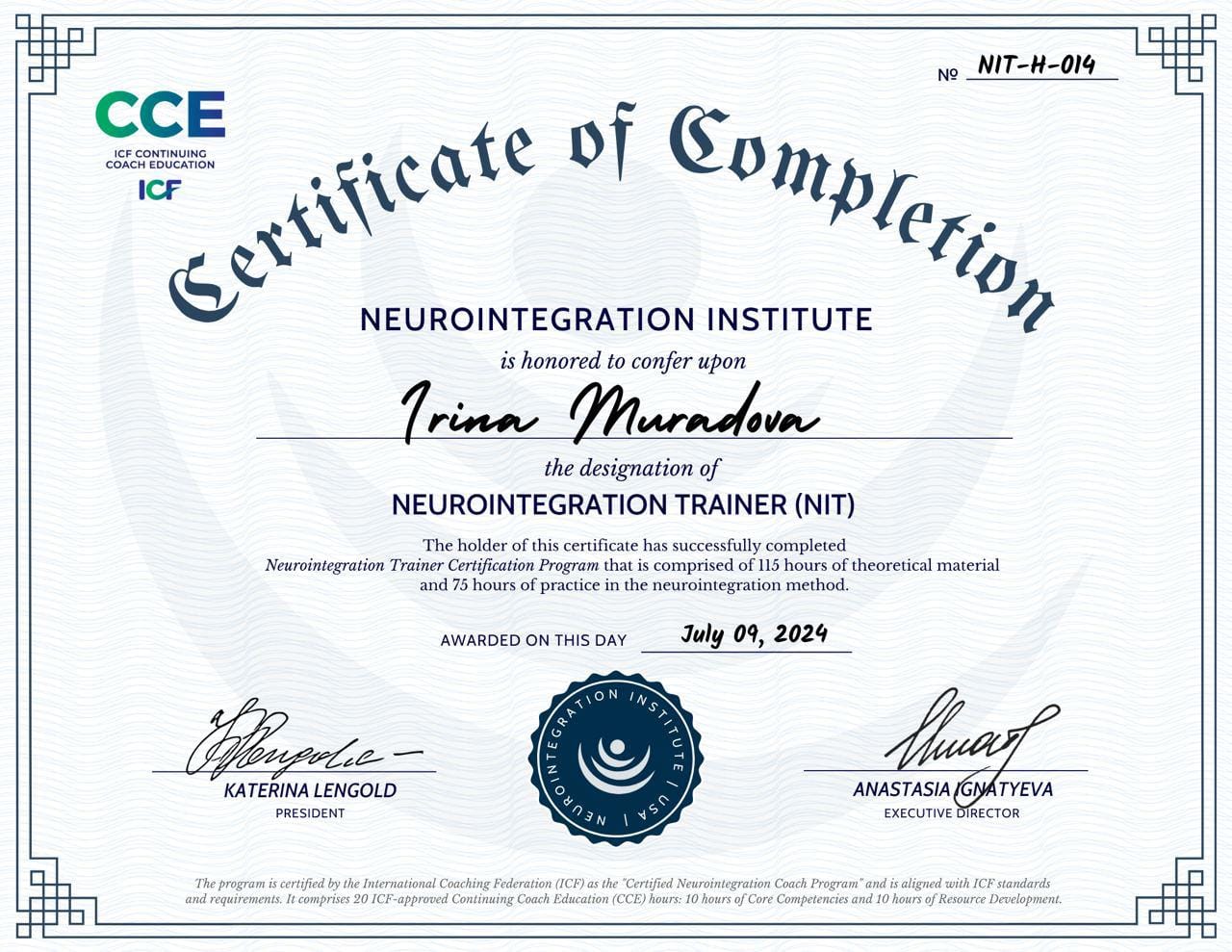 Я сертифицированный тренер по нейроинтеграции (Neurointegration Institute, Калифорния), аккредитованный ICF, сертифицированный тренер по нейропрактикам и автор метода Wavica. Все медитации и нейропротоколы, которые ты проходишь, написаны и озвучены мной лично. Это не копия чужих техник, а система, построенная на доказательной нейробиологии и опыте работы с клиентами.