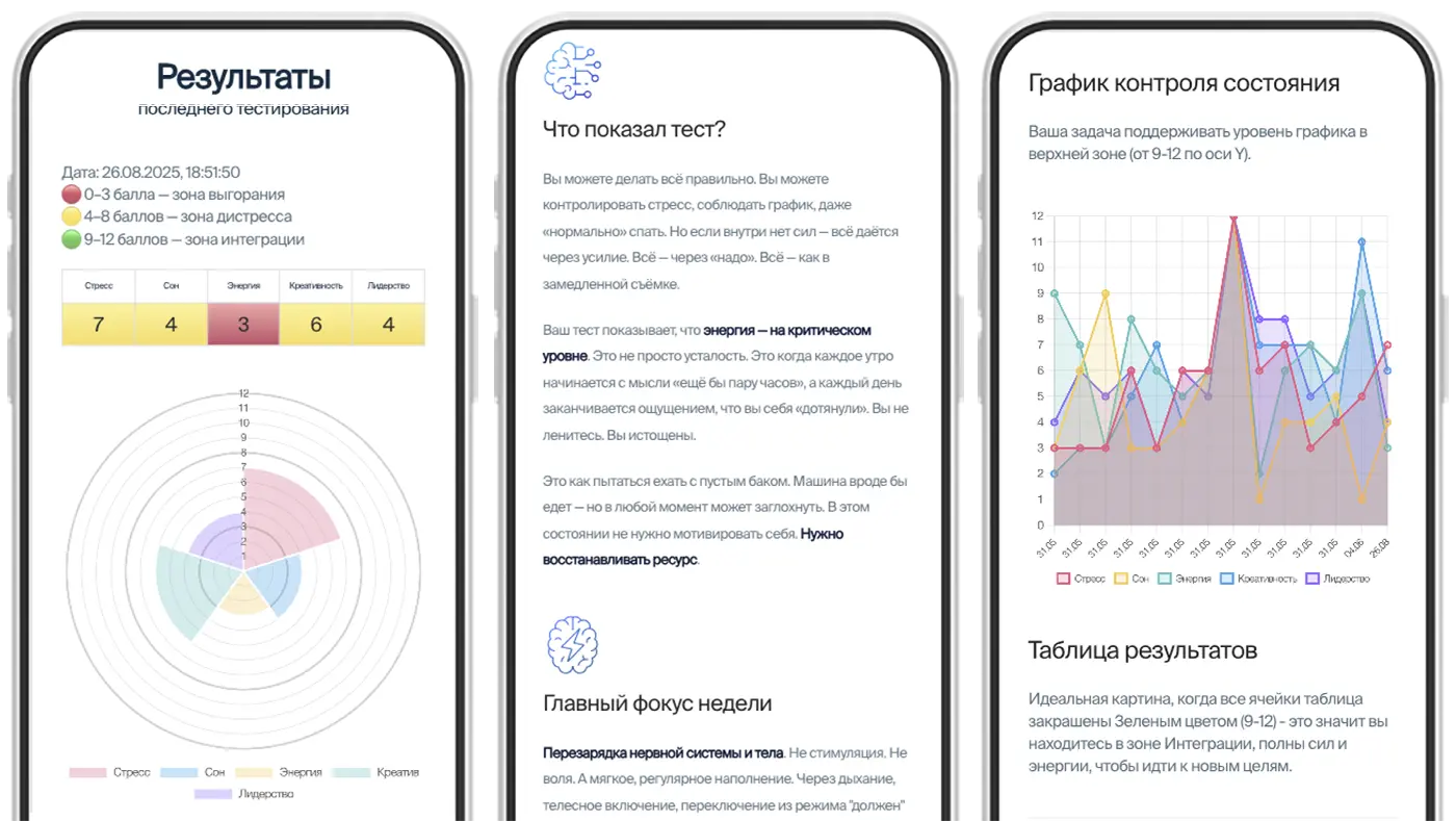 Мы диагностируем ваш нейробаланс и показываем, где именно «ломается система» — стресс, сон, энергия, креативность или лидерство.